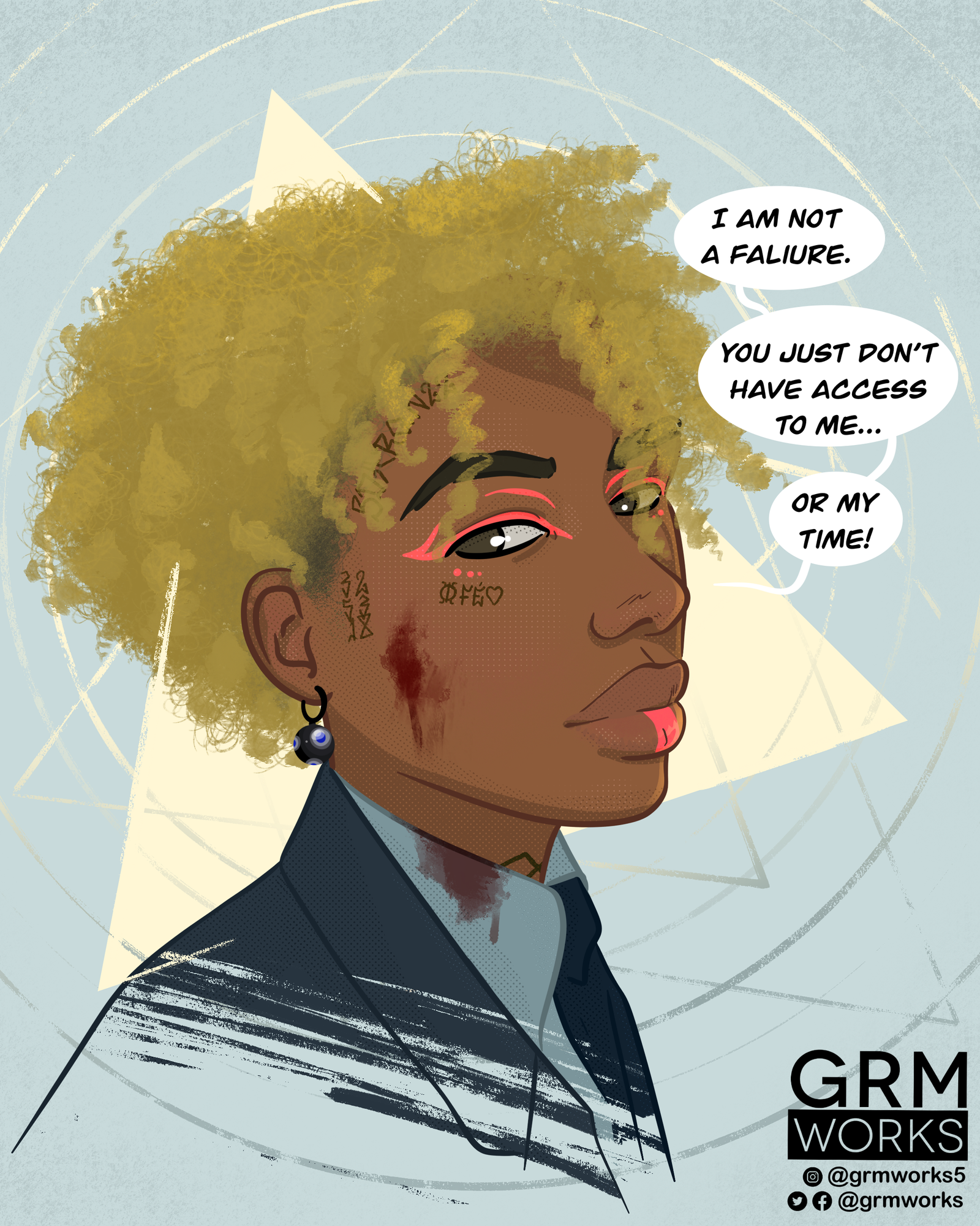 - The hexagonal shapes on the forehead I created as something to represent the body, mind and soul in unity.